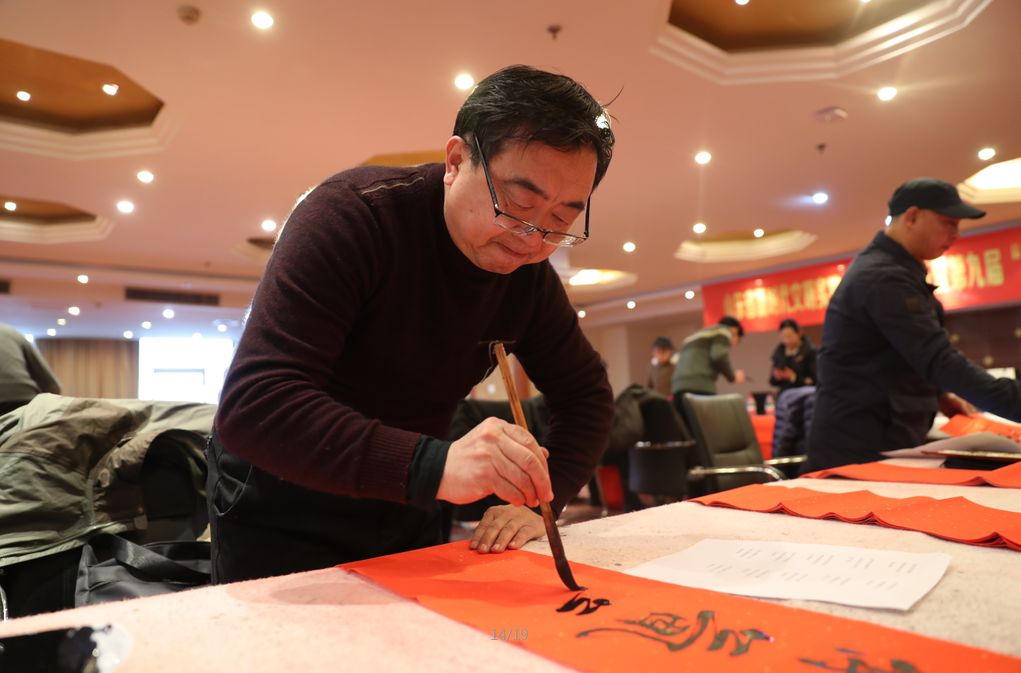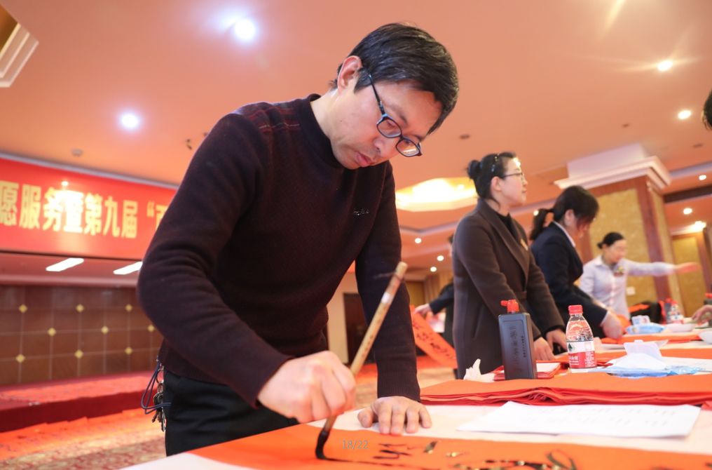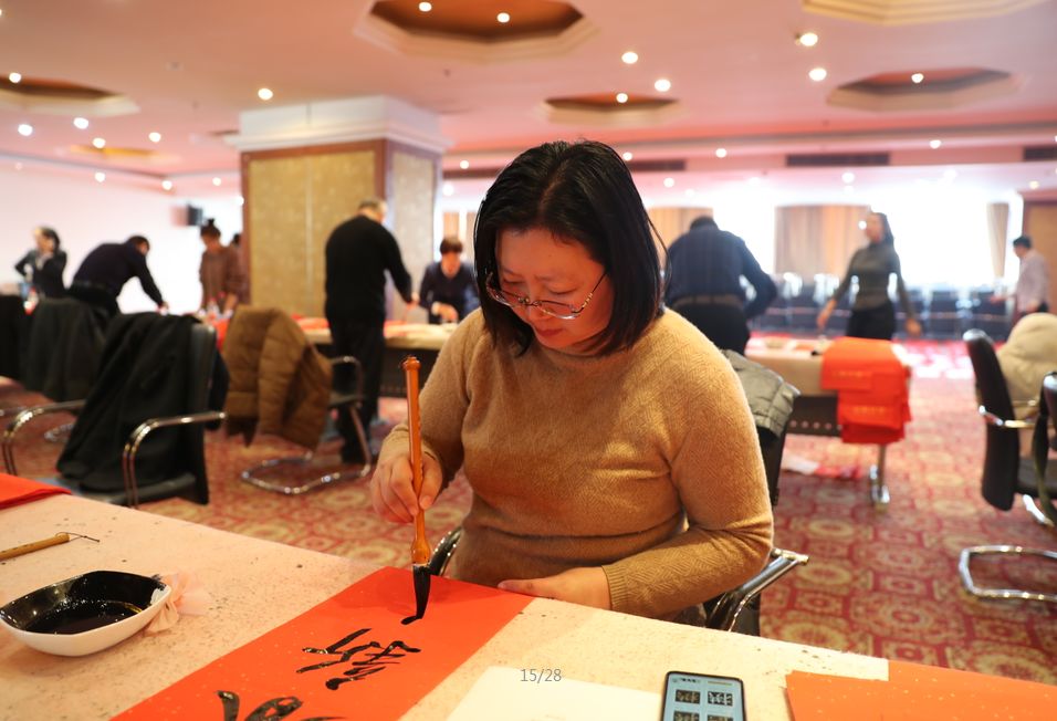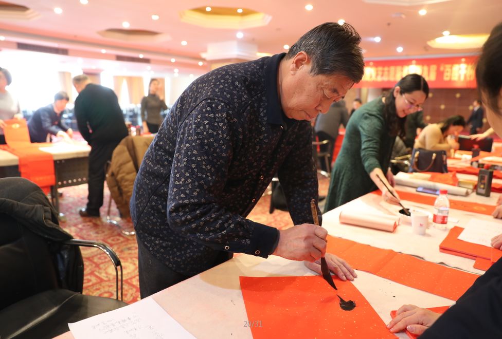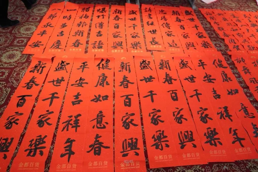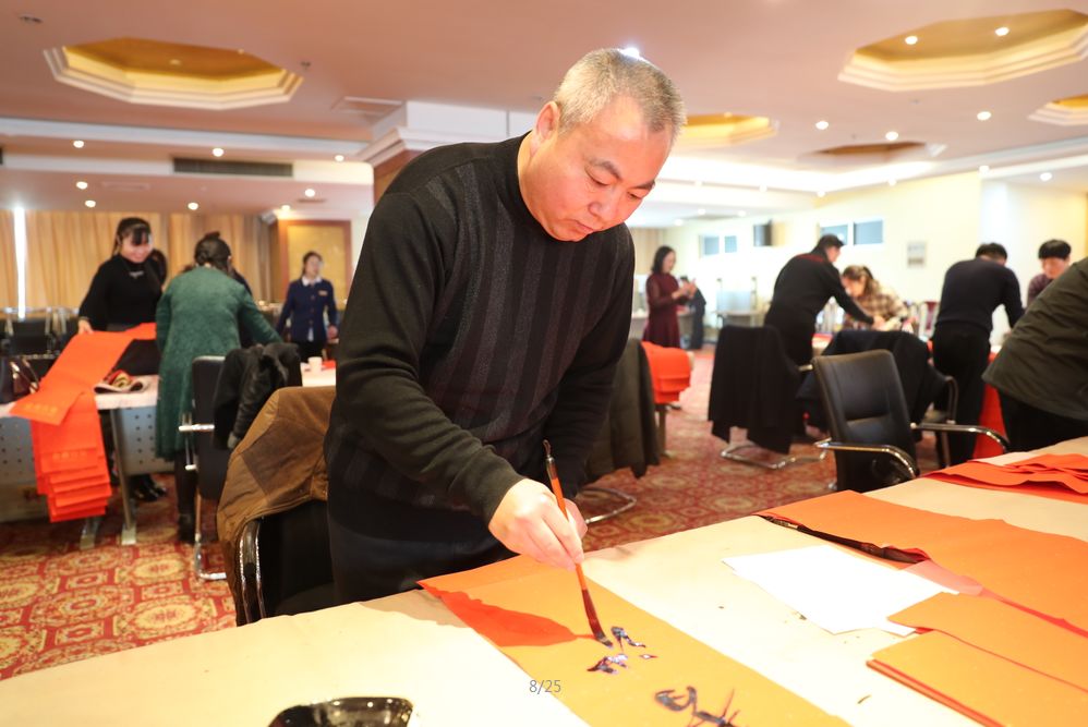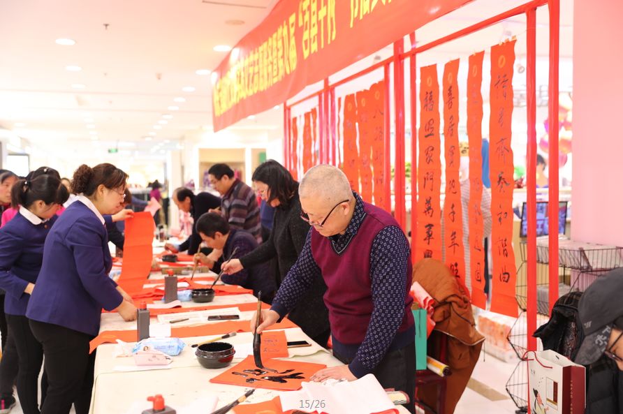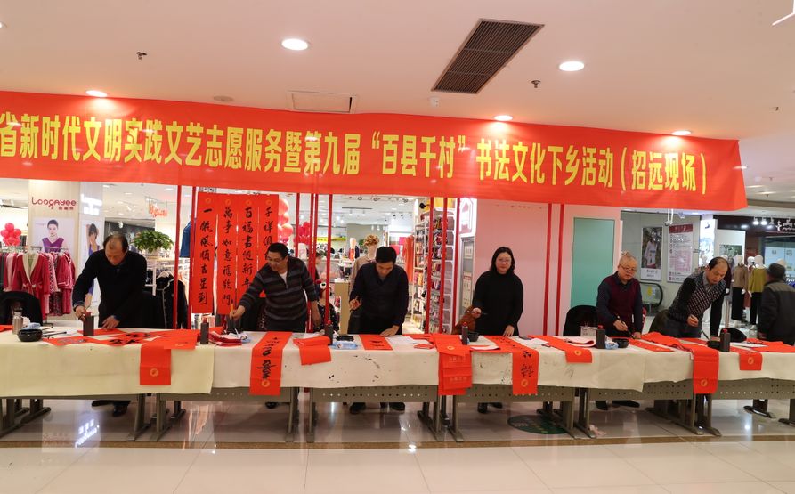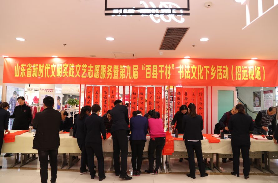 近日,招遠(yuǎn)市書(shū)法家協(xié)會(huì)“我們的中國(guó)夢(mèng)“文化進(jìn)萬(wàn)家,山東省新時(shí)代文明實(shí)踐文藝志愿服務(wù)暨第九屆“百縣千村”書(shū)法下鄉(xiāng)活動(dòng)啟動(dòng)儀式舉行。活動(dòng)現(xiàn)場(chǎng),書(shū)法家們熱情高漲,揮毫潑墨,手寫(xiě)200多幅春聯(lián)現(xiàn)場(chǎng)贈(zèng)送給顧客。 今年的書(shū)法下鄉(xiāng)活動(dòng)招遠(yuǎn)書(shū)協(xié)共組織了100名會(huì)員成立書(shū)法志愿服務(wù)隊(duì),計(jì)劃開(kāi)展四項(xiàng)活動(dòng):一、書(shū)法進(jìn)商場(chǎng)。50名志愿者現(xiàn)場(chǎng)寫(xiě)春聯(lián)5天,書(shū)寫(xiě)春聯(lián)1500副。二、組織80名志愿者在金百集團(tuán)八樓會(huì)議室寫(xiě)春聯(lián)5天完成3500副。三、組織100名志愿者用真草隸篆行五種書(shū)體共同創(chuàng)造長(zhǎng)25米的“福祿壽喜”四條巨幅,懸掛于金都購(gòu)物中心大廳。四、組織100名志愿者分別深入企業(yè)、社區(qū)和學(xué)校送春聯(lián)和福字,把黨的溫暖和書(shū)法愛(ài)好者們的美好新春祝福送到千家萬(wàn)戶。 啟動(dòng)儀式當(dāng)天,書(shū)法家們手寫(xiě)200多幅春聯(lián)現(xiàn)場(chǎng)贈(zèng)送給顧客。