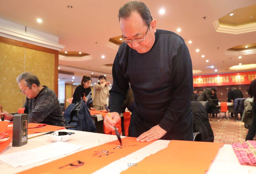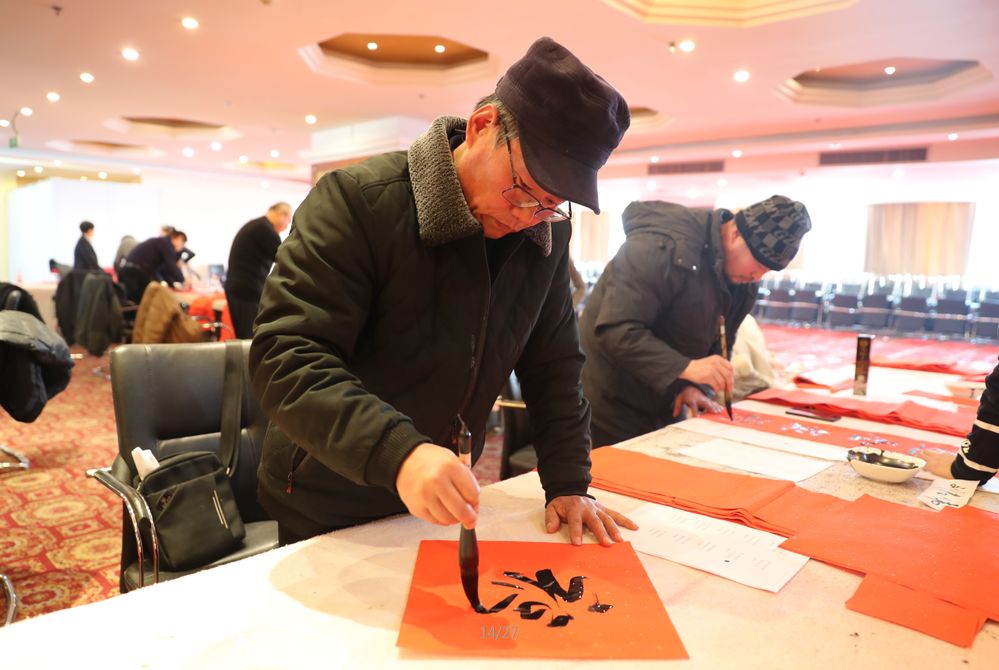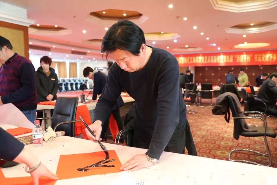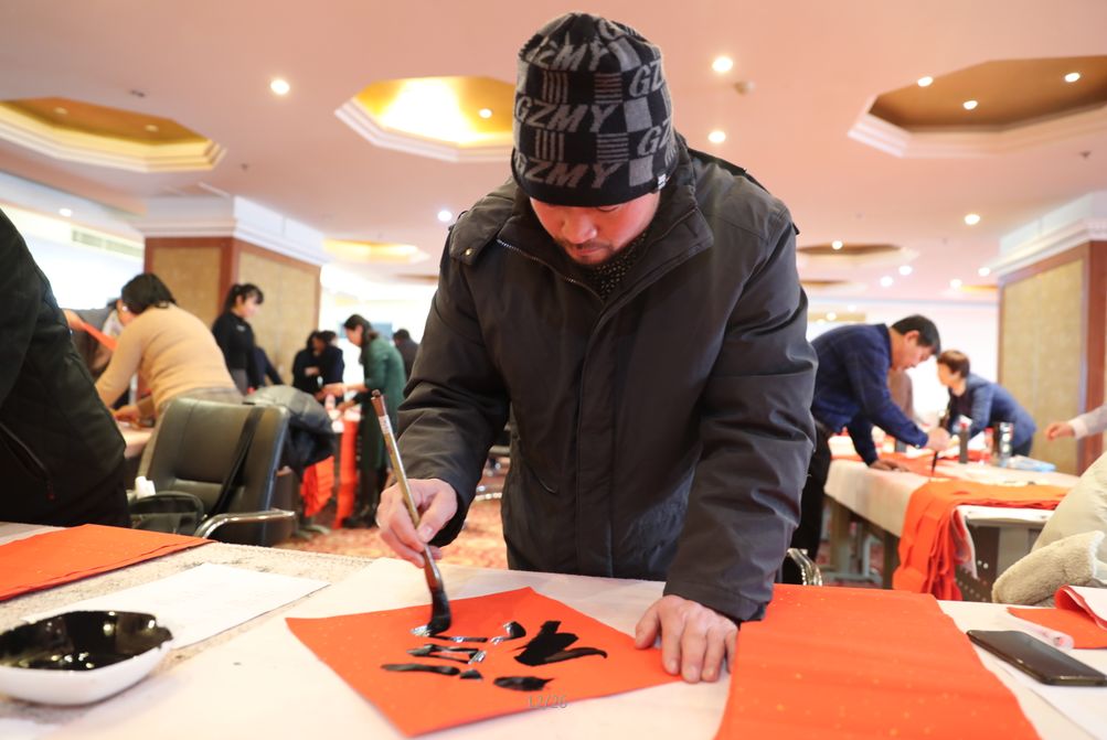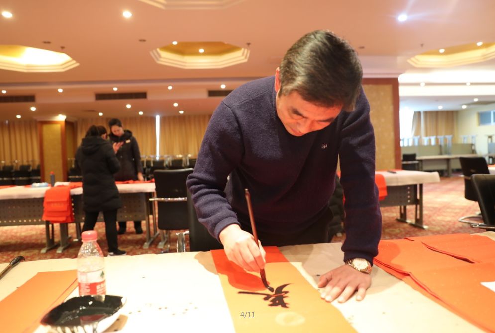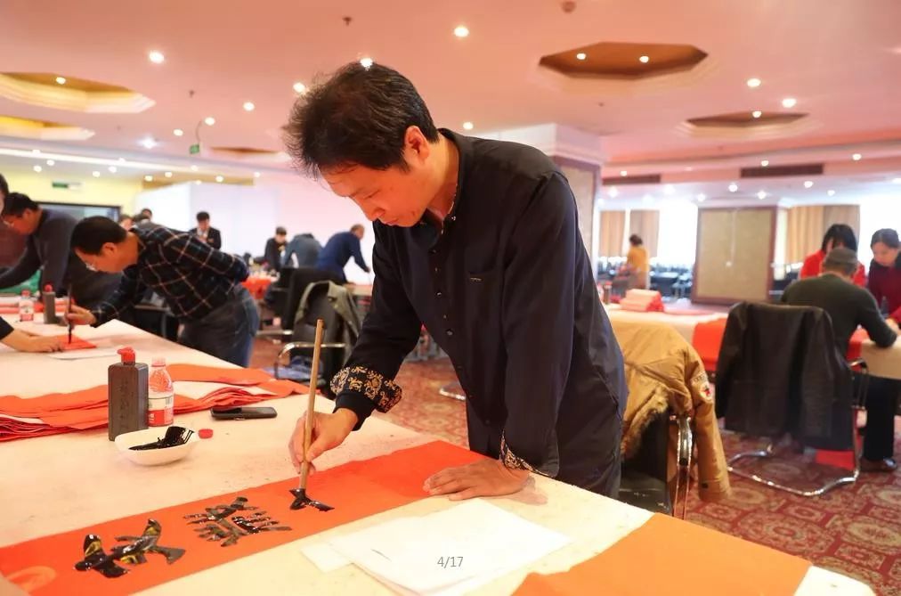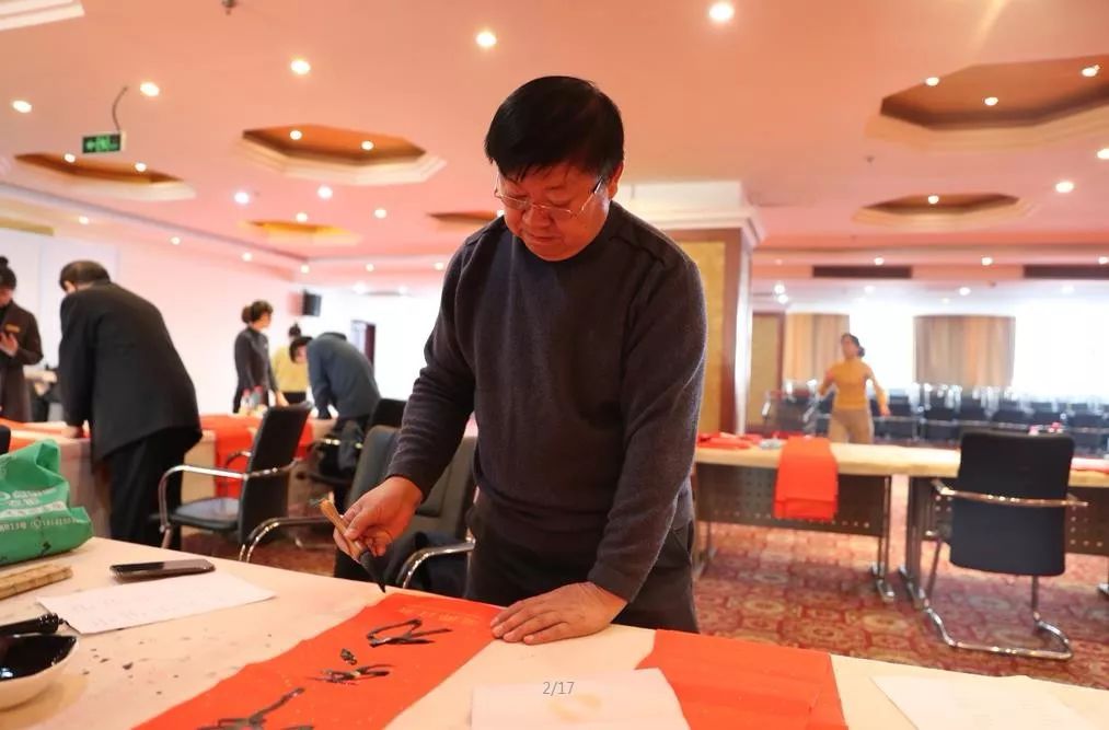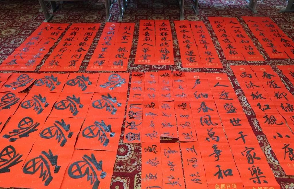 近日,招遠(yuǎn)市書(shū)法家協(xié)會(huì)“我們的中國(guó)夢(mèng)“文化進(jìn)萬(wàn)家,山東省新時(shí)代文明實(shí)踐文藝志愿服務(wù)暨第九屆“百縣千村”書(shū)法下鄉(xiāng)活動(dòng)啟動(dòng)儀式舉行。活動(dòng)現(xiàn)場(chǎng),書(shū)法家們熱情高漲,揮毫潑墨,手寫(xiě)200多幅春聯(lián)現(xiàn)場(chǎng)贈(zèng)送給顧客。 今年的書(shū)法下鄉(xiāng)活動(dòng)招遠(yuǎn)書(shū)協(xié)共組織了100名會(huì)員成立書(shū)法志愿服務(wù)隊(duì),計(jì)劃開(kāi)展四項(xiàng)活動(dòng):一、書(shū)法進(jìn)商場(chǎng)。50名志愿者現(xiàn)場(chǎng)寫(xiě)春聯(lián)5天,書(shū)寫(xiě)春聯(lián)1500副。二、組織80名志愿者在金百集團(tuán)八樓會(huì)議室寫(xiě)春聯(lián)5天完成3500副。三、組織100名志愿者用真草隸篆行五種書(shū)體共同創(chuàng)造長(zhǎng)25米的“福祿壽喜”四條巨幅,懸掛于金都購(gòu)物中心大廳。四、組織100名志愿者分別深入企業(yè)、社區(qū)和學(xué)校送春聯(lián)和福字,把黨的溫暖和書(shū)法愛(ài)好者們的美好新春祝福送到千家萬(wàn)戶。 啟動(dòng)儀式當(dāng)天,書(shū)法家們手寫(xiě)200多幅春聯(lián)現(xiàn)場(chǎng)贈(zèng)送給顧客。