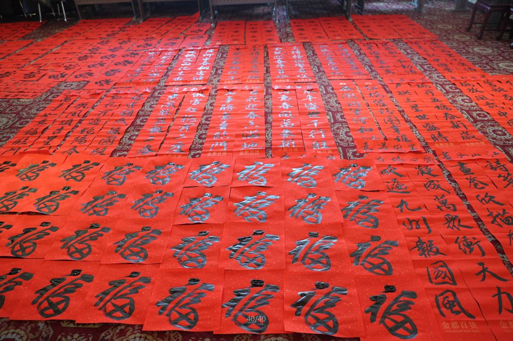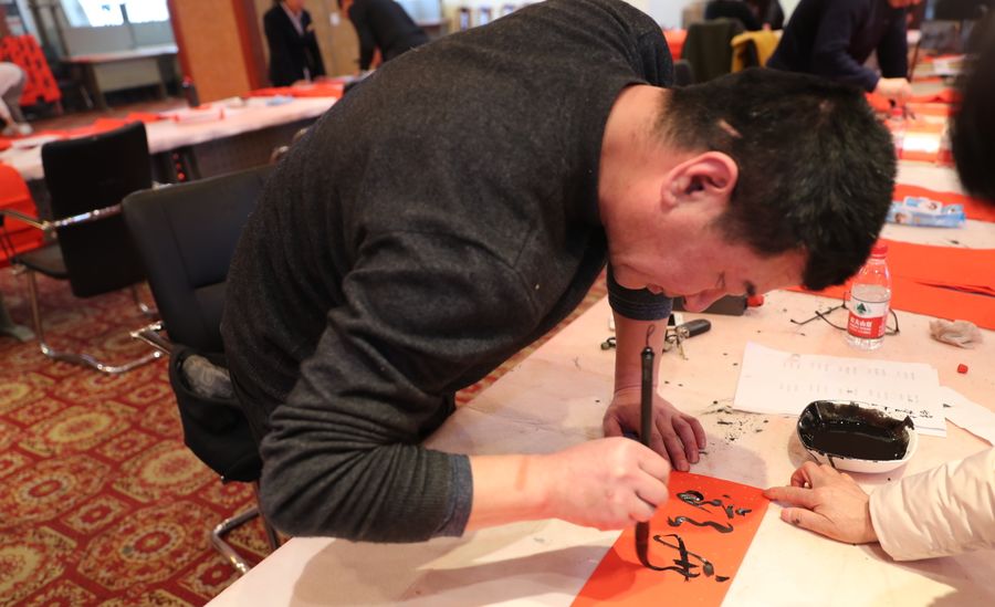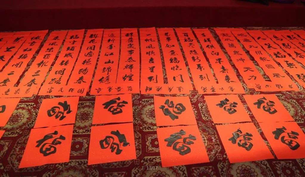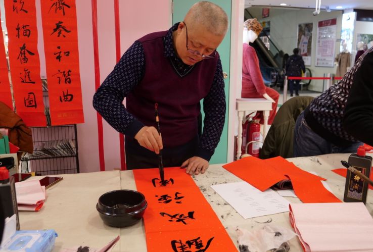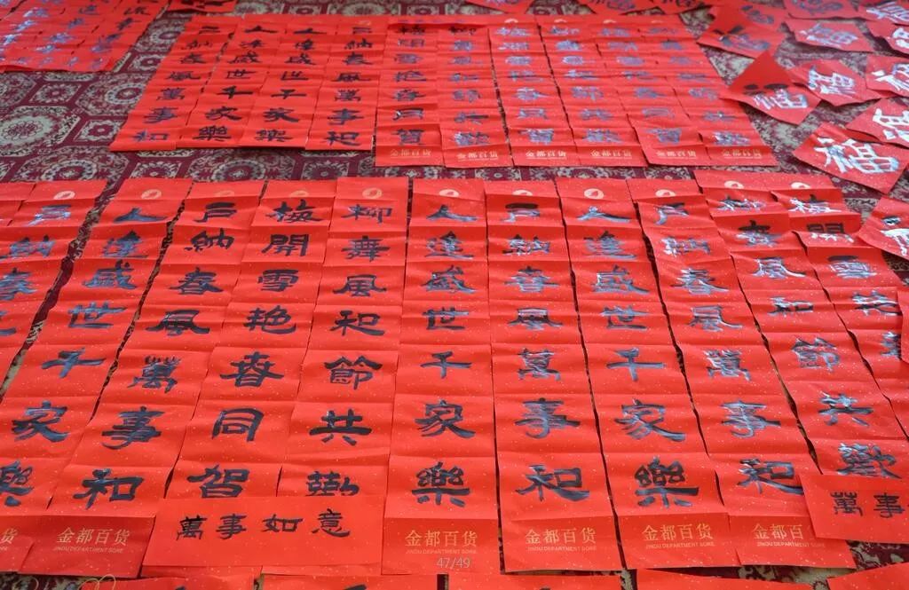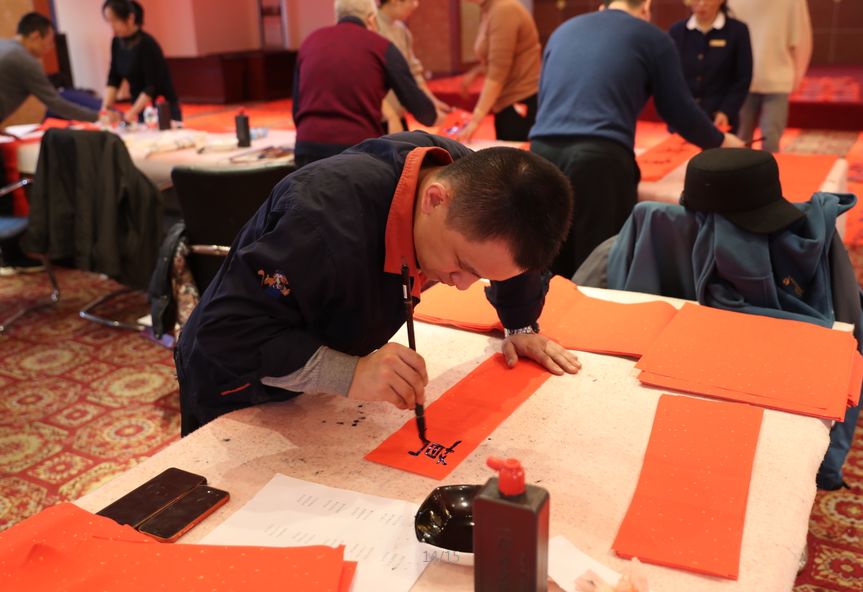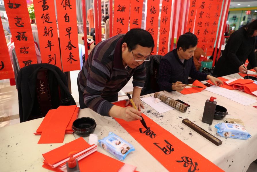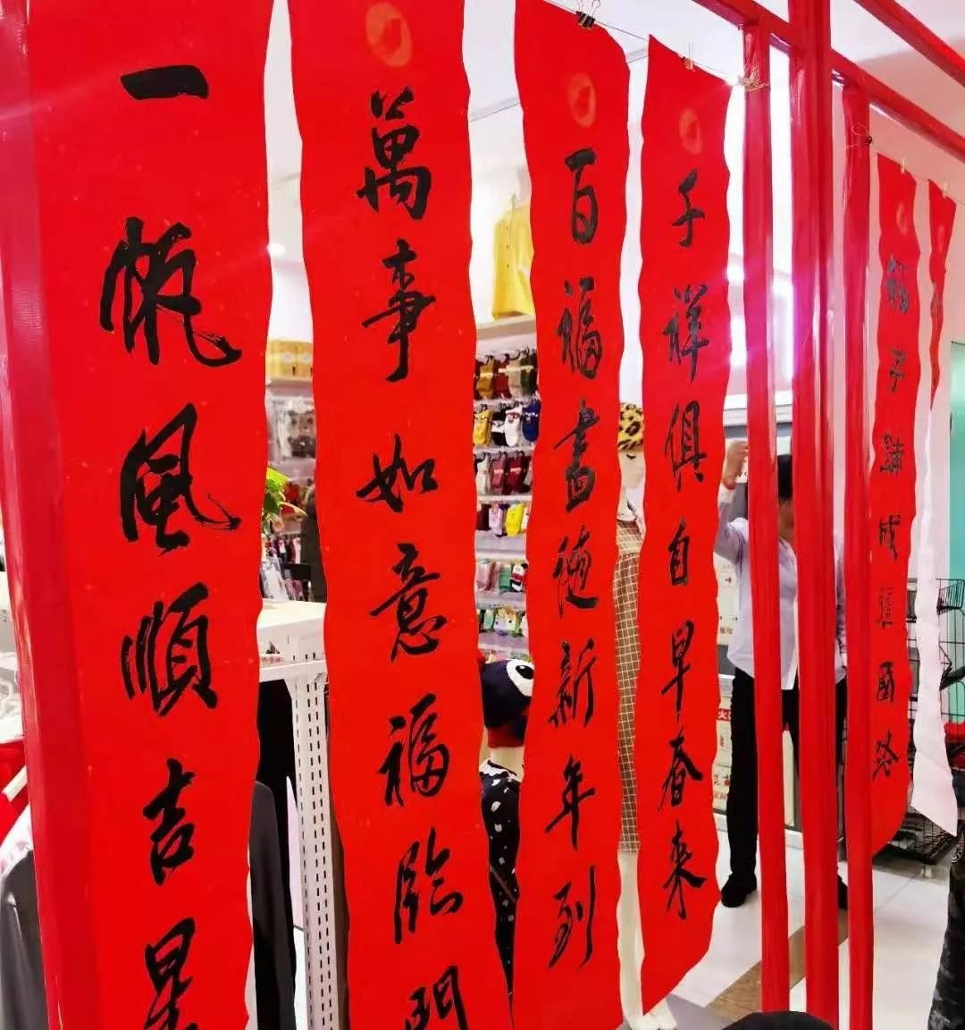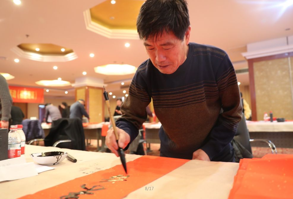 近日,招遠(yuǎn)市書(shū)法家協(xié)會(huì)“我們的中國(guó)夢(mèng)“文化進(jìn)萬(wàn)家,山東省新時(shí)代文明實(shí)踐文藝志愿服務(wù)暨第九屆“百縣千村”書(shū)法下鄉(xiāng)活動(dòng)啟動(dòng)儀式舉行。活動(dòng)現(xiàn)場(chǎng),書(shū)法家們熱情高漲,揮毫潑墨,手寫(xiě)200多幅春聯(lián)現(xiàn)場(chǎng)贈(zèng)送給顧客。 今年的書(shū)法下鄉(xiāng)活動(dòng)招遠(yuǎn)書(shū)協(xié)共組織了100名會(huì)員成立書(shū)法志愿服務(wù)隊(duì),計(jì)劃開(kāi)展四項(xiàng)活動(dòng):一、書(shū)法進(jìn)商場(chǎng)。50名志愿者現(xiàn)場(chǎng)寫(xiě)春聯(lián)5天,書(shū)寫(xiě)春聯(lián)1500副。二、組織80名志愿者在金百集團(tuán)八樓會(huì)議室寫(xiě)春聯(lián)5天完成3500副。三、組織100名志愿者用真草隸篆行五種書(shū)體共同創(chuàng)造長(zhǎng)25米的“福祿壽喜”四條巨幅,懸掛于金都購(gòu)物中心大廳。四、組織100名志愿者分別深入企業(yè)、社區(qū)和學(xué)校送春聯(lián)和福字,把黨的溫暖和書(shū)法愛(ài)好者們的美好新春祝福送到千家萬(wàn)戶。 啟動(dòng)儀式當(dāng)天,書(shū)法家們手寫(xiě)200多幅春聯(lián)現(xiàn)場(chǎng)贈(zèng)送給顧客。