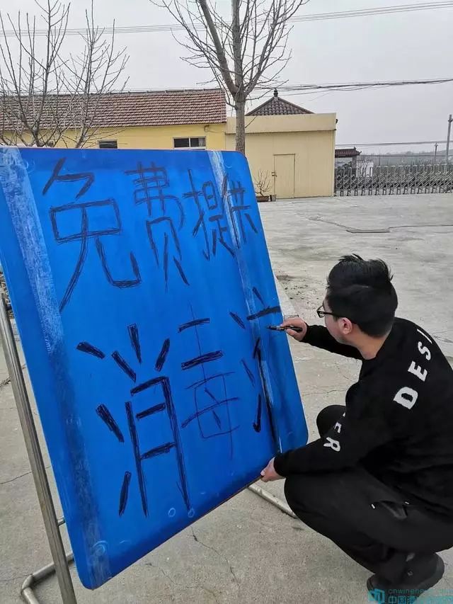 因為工人放假,工廠尚未開工。要干就要自己動手。任玉萍和17歲的兒子從大年初二開始就趕到工廠,配制消毒液?!拔覀兊南疽憾际鞘称芳壍?,平常經(jīng)常使用?!比斡衿几嬖V華夏酒報記者,兒子在公司門口手寫了“免費(fèi)提供消毒液”的提示,很多人通過朋友圈聞訊后聚集而來,這幾天天天門口都圍滿了人。