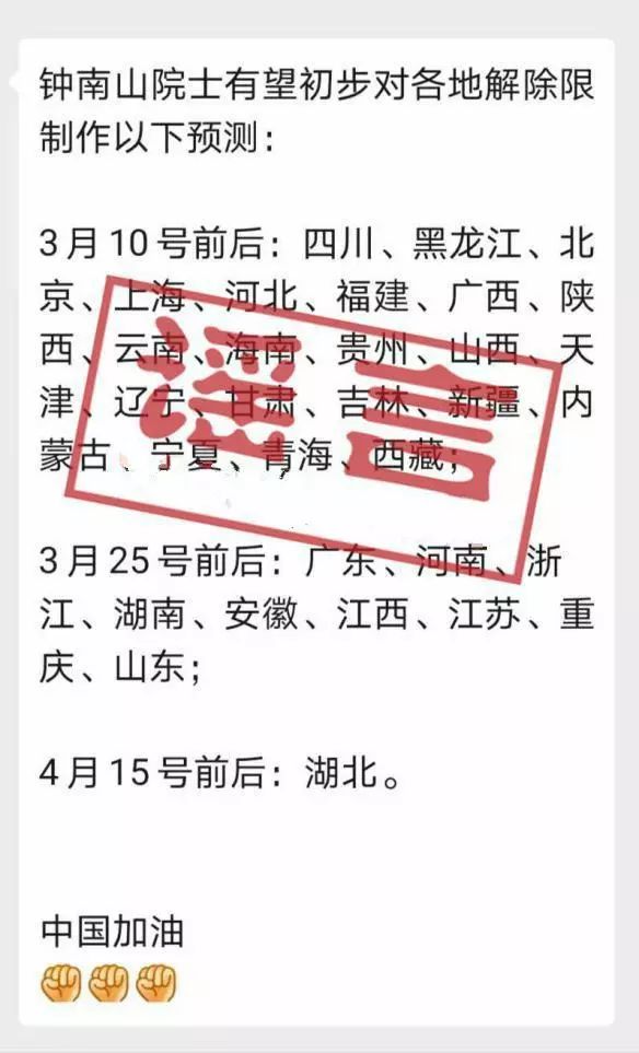 近日,網(wǎng)上流傳“鐘南山院士有望初步對(duì)各地解除限制作預(yù)測(cè)”,其中提及:3月10日到25日前后,包括山東在內(nèi)的大多數(shù)省份將解除限制,4月15日前后湖北也將解除限制。