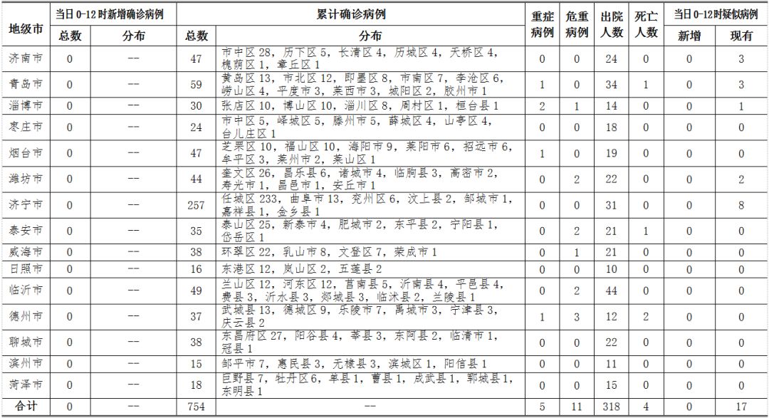 2020年2月23日0-12時,山東省無新增新型冠狀病毒肺炎確診病例,累計確診病例754例(含重癥病例5例,危重癥病例11例,治愈出院318例,死亡病例4例);無新增疑似病例,現(xiàn)有疑似病例17例。截至目前,追蹤到密切接觸者16608人,已解除醫(yī)學觀察14793人,診斷為疑似或確診病例291例,尚有1524人正在接受醫(yī)學觀察。
