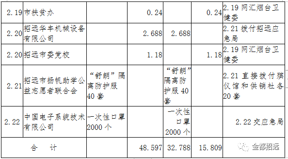 自全市開展抗擊“新型冠狀病毒感染的肺炎疫情”活動以來,招遠(yuǎn)市慈善總會得到了社會各界的積極響應(yīng)和大力支持。截止2月22日24時,累計捐款48.597萬元,按照捐款意愿,用于招遠(yuǎn)市應(yīng)急局疫情防控的資金32.788萬元,已經(jīng)撥付市應(yīng)急局;用于湖北疫情防控的資金15.809萬元,已劃轉(zhuǎn)煙臺衛(wèi)健委;用于招遠(yuǎn)市疫情防控的所有物資全部交到應(yīng)急局。具體捐贈接收和使用情況公示如下: