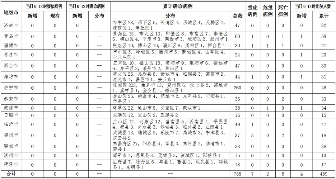 2020年3月2日0-12時(shí),山東省無新冠肺炎疑似病例;無新增確診病例,累計(jì)確診病例758例(其中,重癥病例7例,危重癥病例2例,死亡病例6例);新增治愈出院4例,累計(jì)治愈出院459例。截至目前,追蹤到密切接觸者16909人,尚有544人正在接受醫(yī)學(xué)觀察。