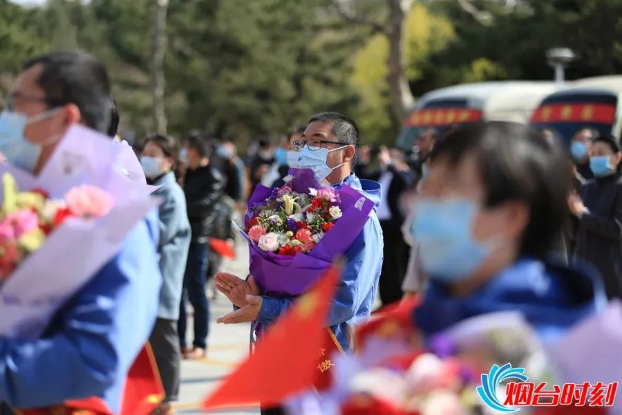 下午14時(shí)30分,醫(yī)療隊(duì)乘坐的大巴緩緩駛?cè)霒|山賓館,迎接他們的是一張張家鄉(xiāng)人民熱情的笑臉、一條條寫(xiě)有“致敬英雄歡迎回家”等真摯話語(yǔ)的條幅。會(huì)場(chǎng)架設(shè)的拱門(mén)上標(biāo)注了“煙臺(tái)市援鄂抗疫醫(yī)務(wù)人員返煙歡迎儀式”。兩側(cè)還設(shè)有26名醫(yī)護(hù)人員的頭像宣傳海報(bào)。當(dāng)車門(mén)開(kāi)啟,工作人員為隊(duì)員們依次獻(xiàn)花,在場(chǎng)的人們列隊(duì)歡迎,熱烈鼓掌,表達(dá)敬意和祝福。