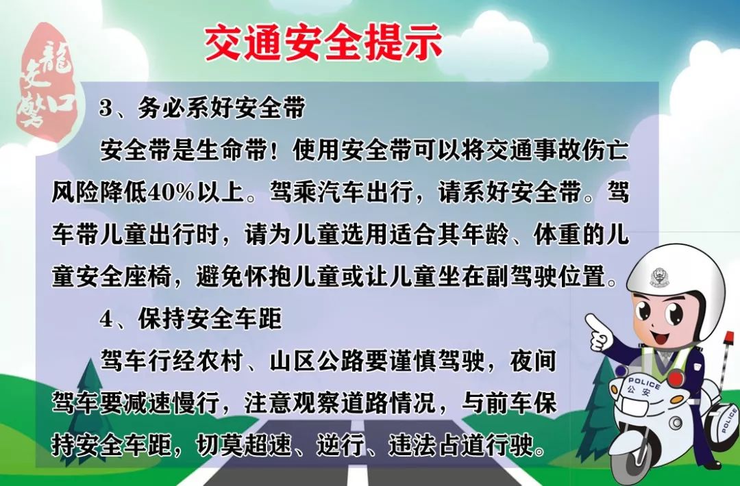 敬請廣大機動車駕駛人駕車或乘車請系好安全帶,不坐私攬客源的“黑"車。拒絕酒后駕駛、超速、超員、超載和疲勞駕駛等交通違法行為。如遇交通擁堵時,請耐心等待,依次排隊通行。
