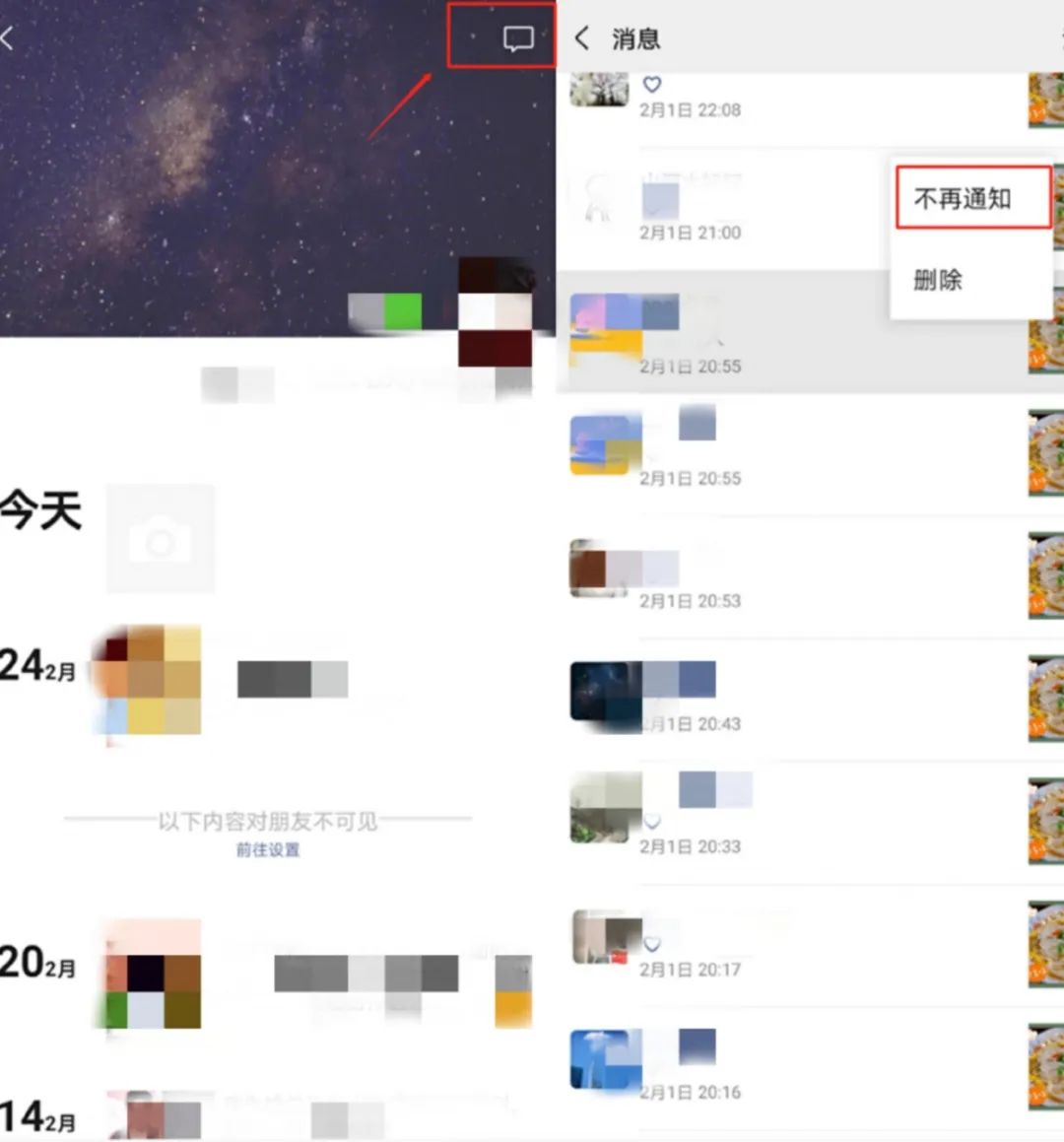 打開微信,點擊【我】-【相冊】-【我的朋友圈】,再點擊右上角的【…】,選擇博文長按點擊【不再通知】即可。