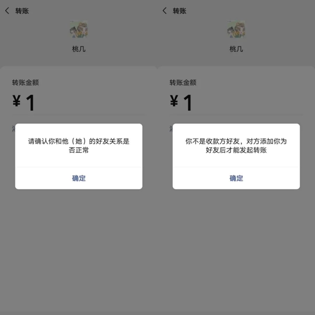 只需1塊錢(無需轉(zhuǎn)出),打開和好友的聊天頁面,選擇【轉(zhuǎn)賬】。輸入金額后,如果顯示“請確認你和他的好友關系是否正常(左圖)”說明你被對方拉黑了。