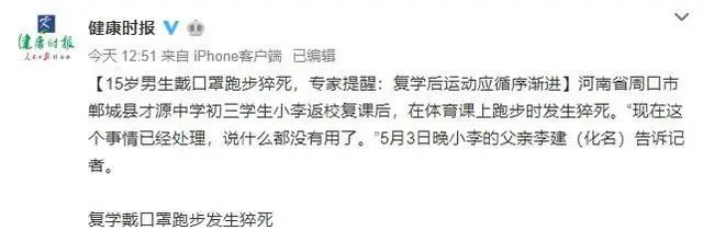 針對近期接連出現(xiàn)的學生跑步猝死案例,暨南大學附屬第一醫(yī)院心臟外科副主任陸華表示,當一個人的正常耗氧量因為口罩等因素受到限制時,活動能力自然會受到限制。如果在戴著口罩的情況下,還要堅持大運動量運動,確實會對身體帶來極大的影響。有時候急性的缺氧會導致體內(nèi)內(nèi)環(huán)境平衡的紊亂,也可能是誘發(fā)猝死的一個因素。