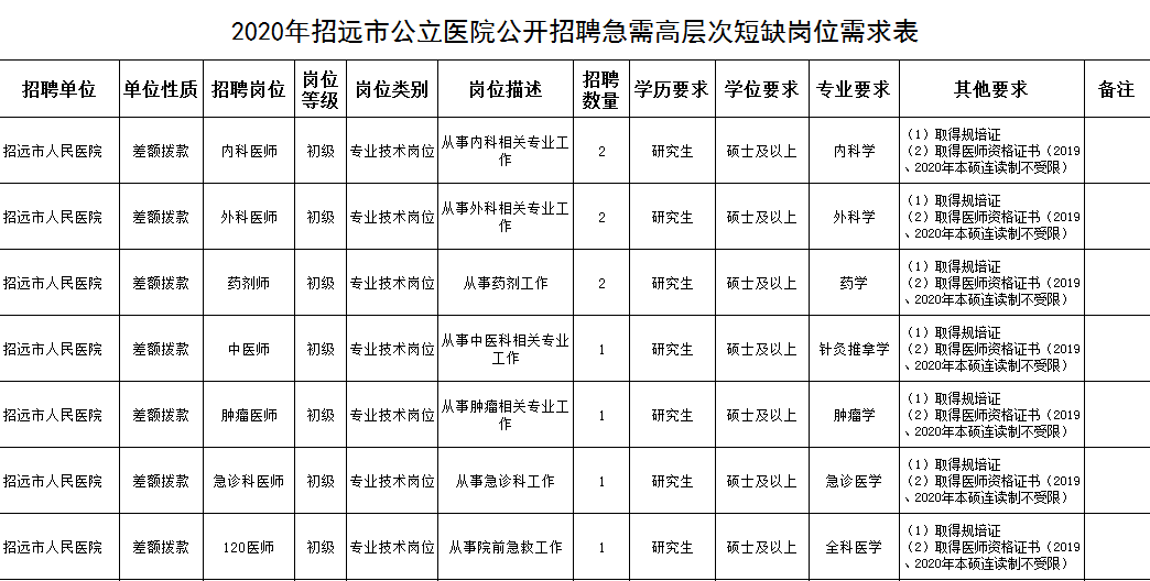 本次招聘共安排招聘計劃20人,招聘崗位詳見附件1《2020年招遠市公立醫(yī)院公開招聘急需高層次短缺人才崗位需求表》(以下簡稱“《崗位需求表》”)。