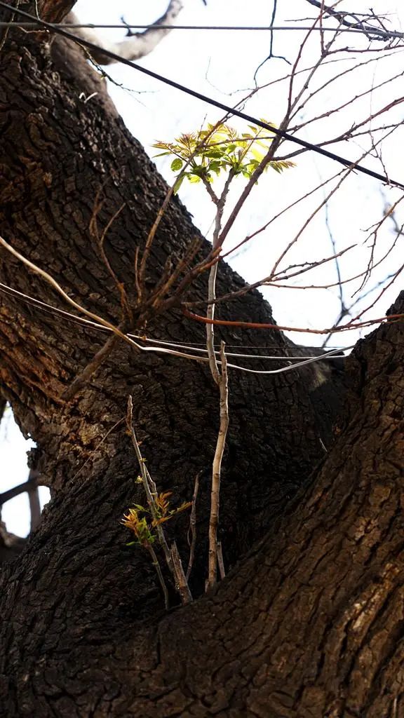 到底是幼小的香椿懷春,喜歡:“大叔控”?還是這株古槐又遇新春,抱得椿樹“枯木逢春”?