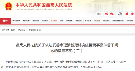 《意見》明確,限制民事行為能力人(8周歲以上的未成年人)未經(jīng)其監(jiān)護人同意,參與網(wǎng)絡付費游戲或者網(wǎng)絡直播平臺“打賞”等方式支出與其年齡、智力不相適應的款項,監(jiān)護人請求網(wǎng)絡服務提供者返還該款項的,人民法院應予支持。