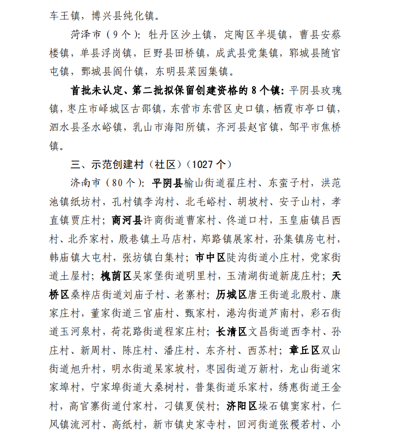 根據(jù)全省鄉(xiāng)村振興戰(zhàn)略規(guī)劃部署要求,在今年1月正式認(rèn)定首批鄉(xiāng)村振興示范縣鄉(xiāng)村的基礎(chǔ)上,省發(fā)展改革委會(huì)同省委組織部等9部門,聯(lián)合啟動(dòng)了第二批鄉(xiāng)村振興“十百千”示范創(chuàng)建工程,探索創(chuàng)新多元模式和成功經(jīng)驗(yàn),以點(diǎn)帶面推動(dòng)全省鄉(xiāng)村振興戰(zhàn)略健康有序進(jìn)行。經(jīng)“各市篩選上報(bào)、省級(jí)聯(lián)合審查、征求意見建議”,并報(bào)請(qǐng)省委、省政府同意,現(xiàn)確定壽光市等13個(gè)縣(市、區(qū))、長清區(qū)文昌街道等108個(gè)鄉(xiāng)(鎮(zhèn)、街)、平陰縣榆山街道翟莊村等1027個(gè)村為第二批示范創(chuàng)建單位。