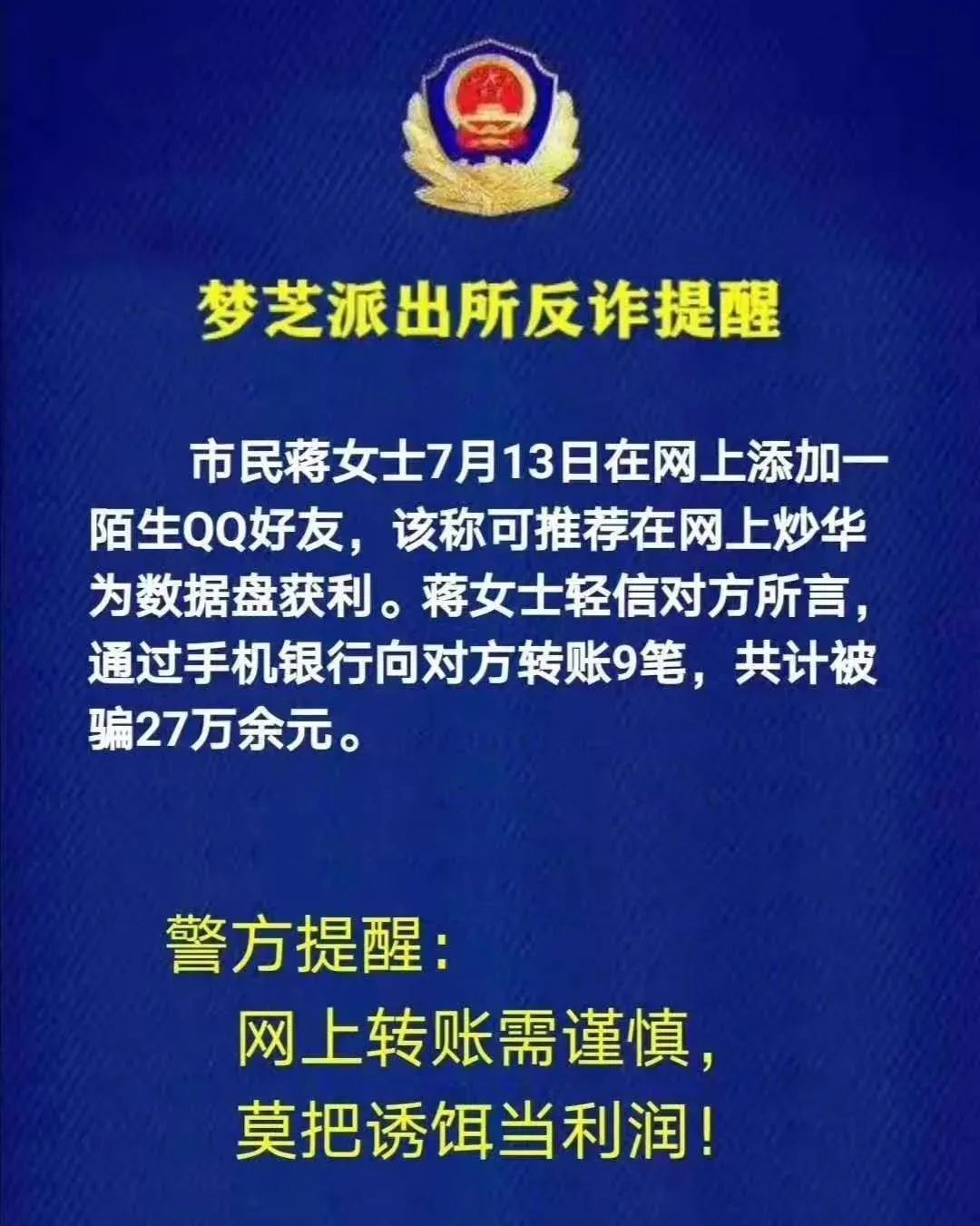 提示中顯示,我市一市民輕信網(wǎng)上炒貨賺錢的謊言,多次匯出巨額金錢,最終被騙。