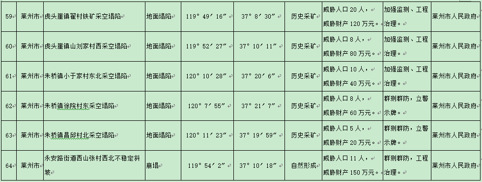 按照要求,我市各地質(zhì)災害防治重點方向,將根據(jù)地質(zhì)災害防治工作需要,選配地質(zhì)災害防治技術支撐單位,增強和提升本地區(qū)防治專業(yè)化水平。另外,推廣借鑒國內(nèi)先進工程治理經(jīng)驗,提升治理理念,有效推進“治用結(jié)合、開發(fā)治理”,鼓勵社會民間資金投入?!?/span> 我市還將地質(zhì)災害防治重點工程。根據(jù)《煙臺市地質(zhì)災害防治規(guī)劃(2005-2020年)》,結(jié)合《煙臺市地質(zhì)災害防治三年(2019-2021年)行動地質(zhì)災害綜合治理和避險移民搬遷工程臺賬》,重點抓好煙臺經(jīng)濟技術開發(fā)區(qū)莊官村周邊采空塌陷工程,煙臺長島綜合試驗區(qū)黑山鄉(xiāng)北莊村東北崩塌地質(zhì)災害治理工程,煙臺市海陽市徐家店鎮(zhèn)采空塌陷地質(zhì)災害治理工程以及煙臺棲霞市中橋地區(qū)巖溶塌陷搬遷避讓工程這4處省財政補助地質(zhì)災害隱患點治理。 煙臺市2020年64處重要地質(zhì)災害隱患點一覽表: