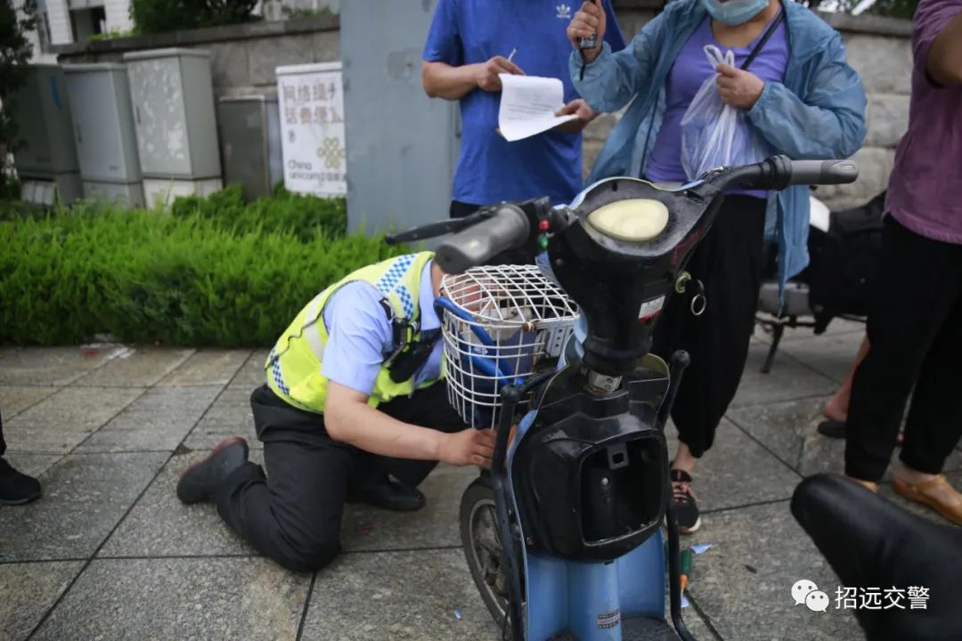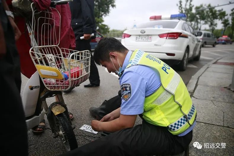 7月23日9時許,招遠(yuǎn)交警大隊一中隊輔警郭明政與同事在溫泉路河?xùn)|路口處,為過往群眾辦理電動車掛牌業(yè)務(wù)。雨時下時停,但絲毫沒有影響小郭和同事們的熱情?!按蟾?,您別急,我把這個電動車牌掛上就看看您的車?!薄按笠蹋@個車需要提供購車發(fā)票和合格證?!毙」托牡南蛉罕娊忉屴k理程序。有的電動車車架號在車底,為了方便,小郭單膝跪地查看登記。