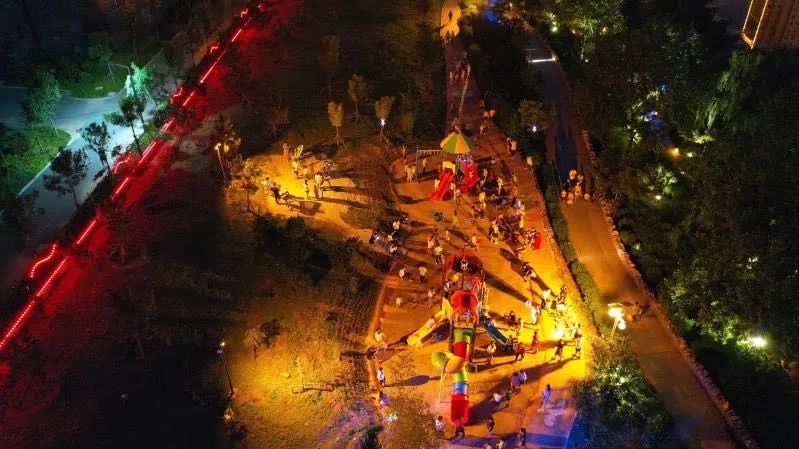 金龍河公園東側(cè)景觀路上家長(zhǎng)和小朋友熙熙攘攘,歡聲笑語不斷