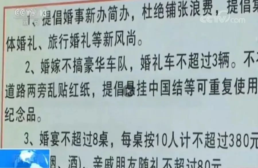 要堅持走好群眾路線,在充分聽取和吸收群眾意見建議的基礎(chǔ)上,明確規(guī)定喜事操辦時限、待客范圍、宴席價位和禮金數(shù)額等標(biāo)準(zhǔn),并納入村規(guī)民約,教育引導(dǎo)群眾擁護(hù)、遵守。沂水提倡彩禮不超1萬元,喜宴不超10桌,婚車不超6輛。同時,黨員干部要發(fā)揮示范帶頭作用,嚴(yán)格要求黨員干部認(rèn)真落實婚事簡辦規(guī)定,自覺接受組織和群眾監(jiān)督,帶頭倡導(dǎo)文明、節(jié)儉、崇德的社會風(fēng)尚。