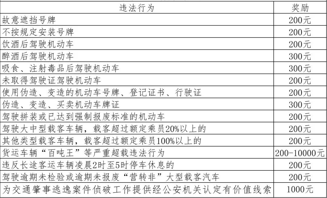 1、舉報故意遮擋號牌、不按規(guī)定安裝車輛號牌獎勵200元,原有嚴重違法行為舉報獎勵金額不變。