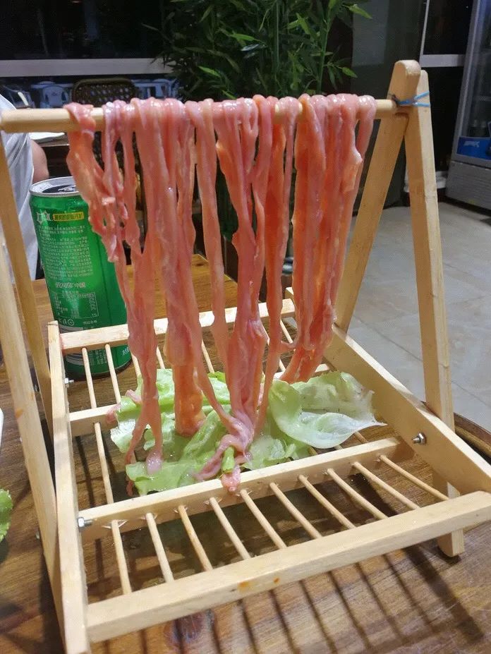 在漏勺里面盛上鴨腸放到火鍋里煮