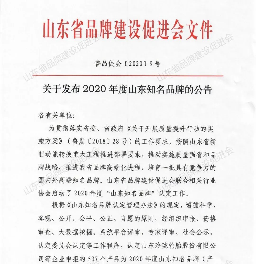 認定山東玲瓏輪胎股份有限公司等企業(yè)申報的537個產(chǎn)品為2020年度山東知名品牌(產(chǎn)品);