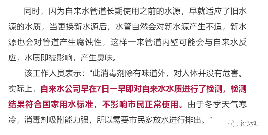 所以,近期招遠(yuǎn)市的自來水需要居民們放水一定時(shí)間后再使用。另外,如果不喜歡水中的氯味,也就是消毒水味,建議居民接自來水,然后將水倒在敞開的容器里放置一天,這樣氯味就會(huì)揮發(fā)掉。