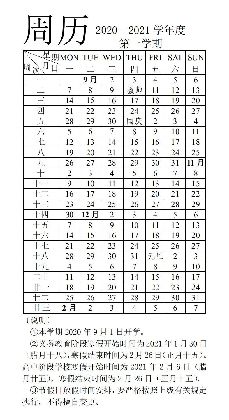 (一)寒假:義務(wù)教育階段學(xué)校具體時間為2021年2月1日(臘月二十)—2月28日(正月十七),3月1日(正月十八)開學(xué);普通高中具體時間為2021年2月6日(臘月二十五)—2月26日(正月十五),2月27日(正月十六)開學(xué)。(二)暑假:義務(wù)教育階段學(xué)校具體時間為2021年7月7日—8月31日,9月1日開學(xué);普通高中具體時間為2021年7月14日—8月31日,9月1日開學(xué)。(三)公共節(jié)假日:原則上按照國家有關(guān)規(guī)定執(zhí)行,無特殊情況不再通知。因故需要調(diào)整節(jié)假日安排,以及因?qū)W業(yè)水平考試、中考、高考等設(shè)置考試而耽誤學(xué)生正常上課時間的,學(xué)??砂凑諏Φ葧r間進行調(diào)整,須提前按規(guī)定程序?qū)徟蛡浒?。調(diào)整方案確定后要及時向?qū)W生、家長和社會公布。按照省教育廳有關(guān)要求,結(jié)合臨沂市實際,現(xiàn)就2021年全市普通中小學(xué)假期安排有關(guān)工作通知如下。