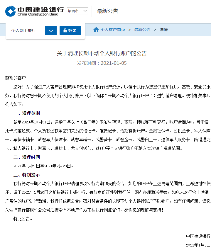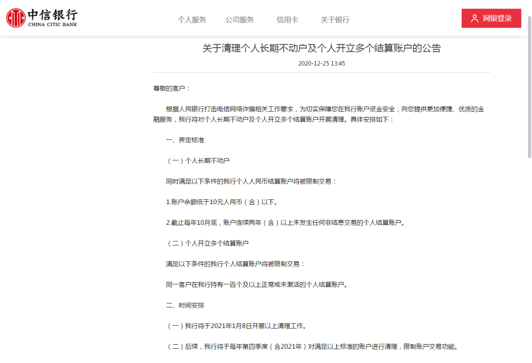 將于2021年1月8日起,對賬戶余額低于10元人民幣(含)以下,以及截止每年10月底,賬戶連續(xù)兩年(含)以上未發(fā)生任何非結(jié)息交易的個人結(jié)算賬戶展開清理工作。同一客戶在中信銀行持有一百個及以上正?;蛭醇せ畹膫€人結(jié)算賬戶也將被限制交易。后續(xù),該行將于每年第四季度(含2021年)對滿足以上標(biāo)準(zhǔn)的賬戶進行清理,限制賬戶交易功能。