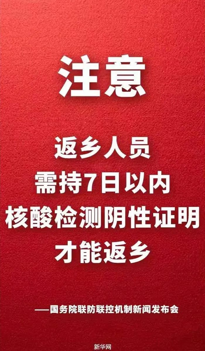 - 春節(jié)期間,返鄉(xiāng)人員需持7日以內(nèi)的核酸陰性檢測證明才能返鄉(xiāng),返鄉(xiāng)后,當?shù)氐幕鶎诱獙ζ溥M行網(wǎng)格化管理。