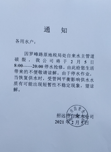 今日,因羅峰路原地稅局處自來(lái)水主管道破裂,自來(lái)水公司將于2月5日8:00——20:00停水搶修。