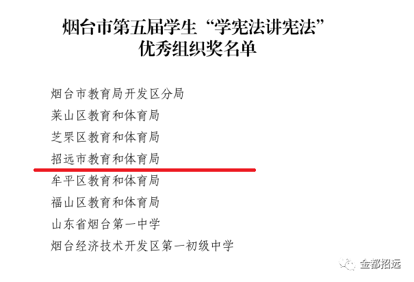 近日,由煙臺市教育局和司法局主辦的2020年全市中小學(xué)“憲法小衛(wèi)士”活動以及第五屆學(xué)生“學(xué)憲法講憲法”演講和知識競答成績公布。招遠(yuǎn)市教育和體育局榮獲優(yōu)秀組織獎,3位老師榮獲優(yōu)秀指導(dǎo)教師稱號,6位同學(xué)喜登榜單。現(xiàn)將獲獎結(jié)果予以公布。