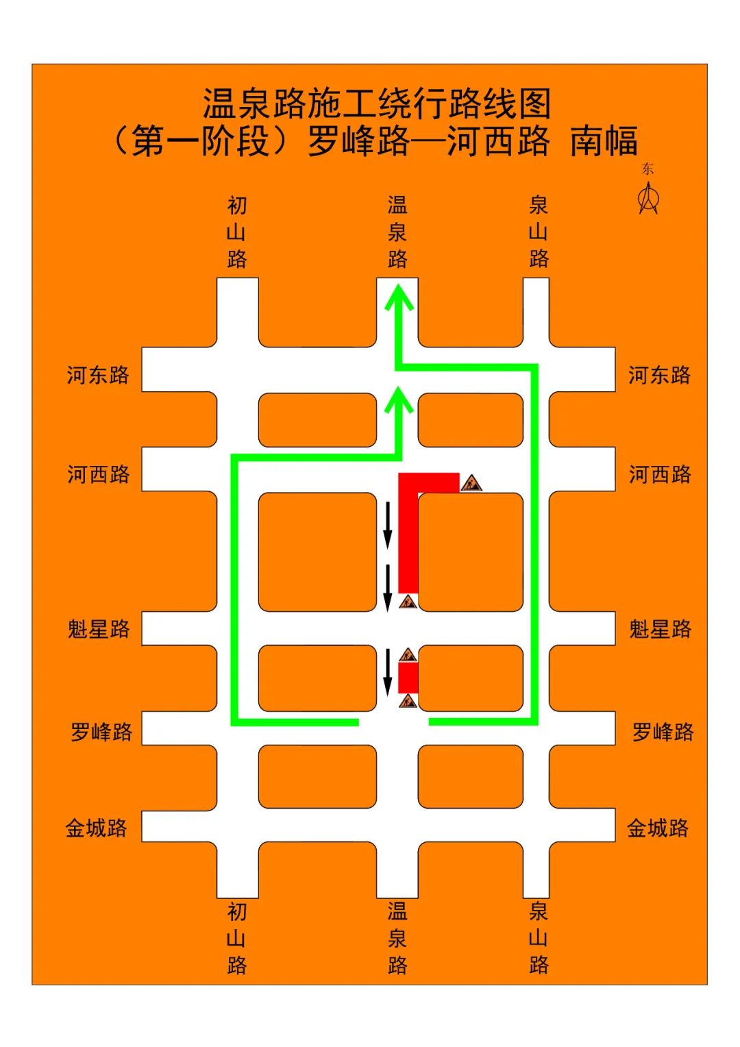 第三階段:羅峰路至河西路北幅封閉,但依然是自東向西行駛的車輛可正常通行,自西向東行駛的車輛可從溫泉路羅峰路口向左或向右轉(zhuǎn)繞行至初山路或泉山路。