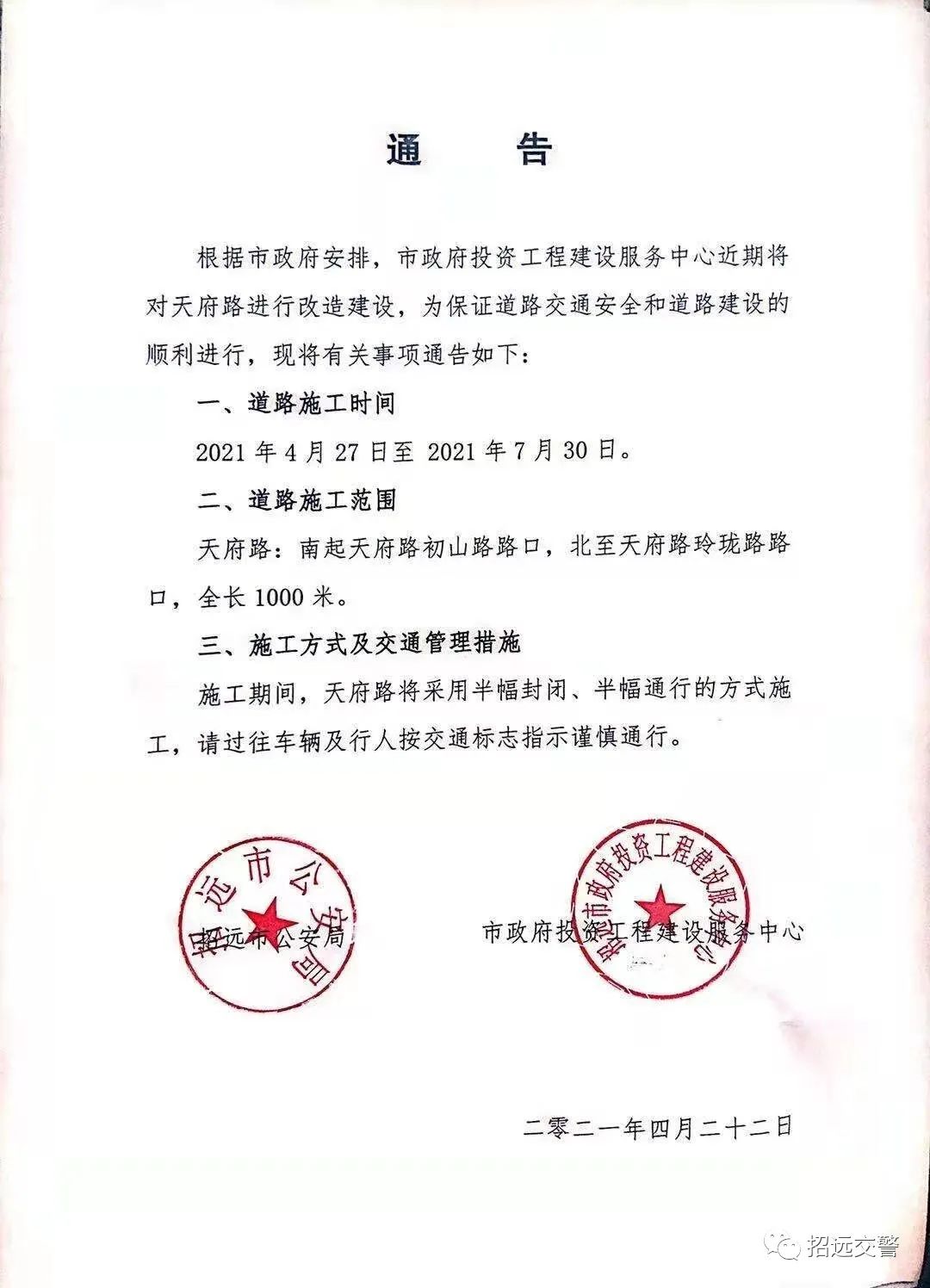 根據(jù)市政府要求,市政府投資工程建設服務中心近期將對天府路進行改造建設,為保證道路交通安全和道路建設的順利進行,現(xiàn)將有關(guān)事項通告如下: