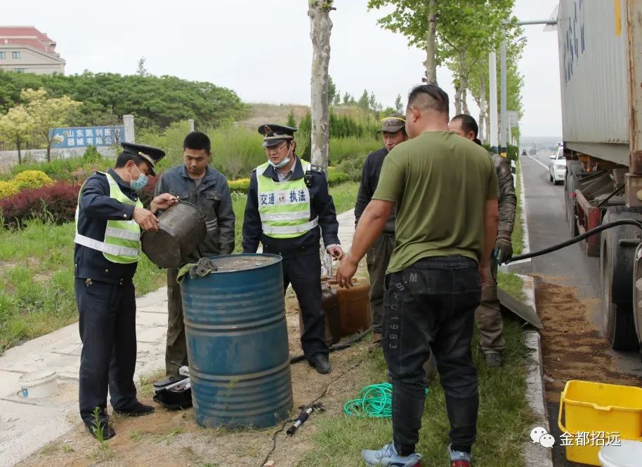 經(jīng)過(guò)執(zhí)法人員對(duì)該車油箱進(jìn)行全面細(xì)致檢查,發(fā)現(xiàn)該車油箱底部疑似被路面石塊撞擊發(fā)生破損,柴油正不停地流到路面上。由于車?yán)餂](méi)有配備油桶等工具,貨車駕駛員一臉茫然地站在路邊,一時(shí)間不知所措,只能眼睜睜地看著車載柴油往外面流?!摆s緊幫忙排除險(xiǎn)情”。在幫助駕駛員在車輛后方150米處放置警示三腳架后,中隊(duì)長(zhǎng)朱德利立刻帶領(lǐng)其他2名隊(duì)員和司機(jī)一起對(duì)油箱進(jìn)行處置?!坝拖淦茡p的口子太大了,要趕緊找油桶把柴油收集起來(lái),減少損失,減輕對(duì)道路的污損”。中隊(duì)長(zhǎng)朱德利立馬聯(lián)系附近的一家公路工程公司請(qǐng)求幫助,該公司迅即組織了3名人員,駕駛鏟車帶著5個(gè)塑料油桶、1個(gè)大號(hào)鐵桶和電動(dòng)抽油泵趕到現(xiàn)場(chǎng)。經(jīng)過(guò)50分鐘的緊張作業(yè),交通執(zhí)法人員與其他人一起將油箱里面的柴油全部抽到油桶里,而3名執(zhí)法人員雙手和衣服上已經(jīng)沾滿了柴油。