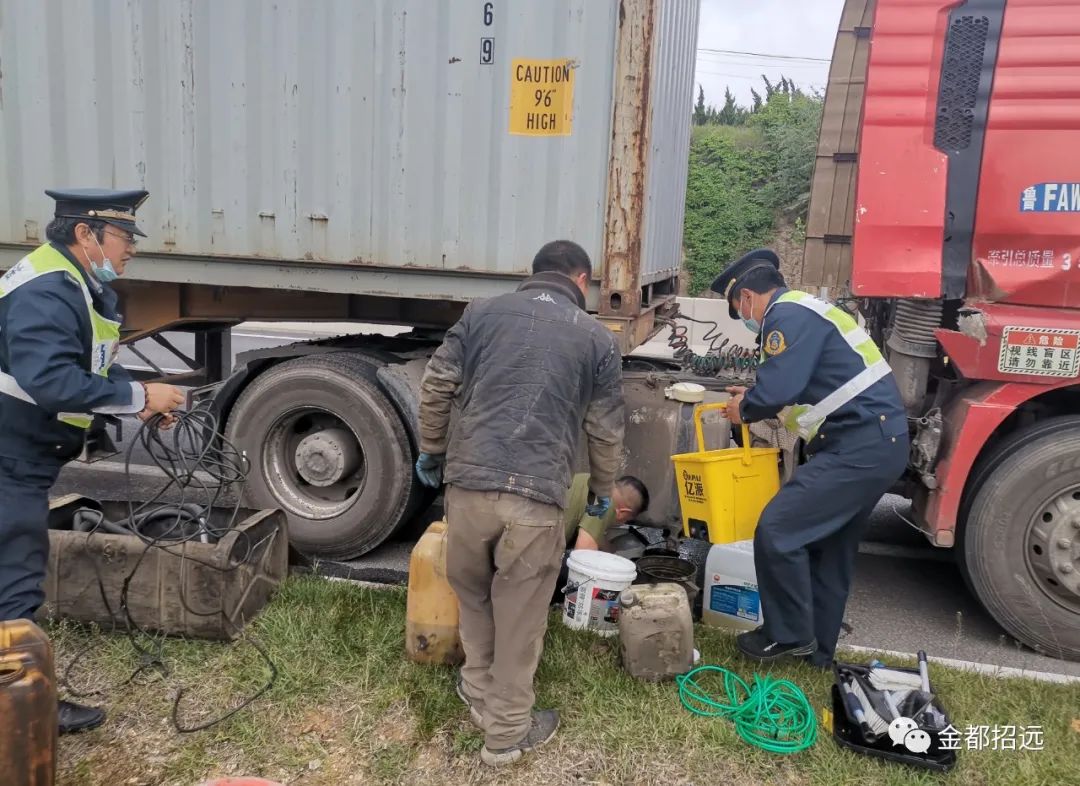 “多虧了交通運(yùn)輸執(zhí)法監(jiān)察大隊(duì)3名同志及時(shí)發(fā)現(xiàn)車輛油箱漏油,并幫助我把剩余的柴油收集起來(lái),使我化險(xiǎn)為夷。集裝箱里是今天下午來(lái)招遠(yuǎn)市剛裝的10多噸粉絲,本來(lái)是晚上要運(yùn)到煙臺(tái)港出口韓國(guó)的。油箱里面也剛剛加上400多公升的柴油,現(xiàn)在看來(lái)收集起來(lái)的柴油有200多公升,為我挽回了1500多元的經(jīng)濟(jì)損失不說(shuō),更重要的是第一時(shí)間消除道路交通安全隱患,保障后車安全行車,也避免了自身車輛發(fā)生火災(zāi)或者半路拋錨等情況的發(fā)生,這樣我換上新的油箱就可以出發(fā)了,不耽誤晚上裝船,真是太感謝你們了,要不是你們及時(shí)發(fā)現(xiàn),及時(shí)出手相助,在關(guān)鍵時(shí)候伸出援手排除險(xiǎn)情,后果真是不堪設(shè)想?!必涇囻{駛員蓋云濤握著朱德利的手,連聲說(shuō)著謝謝。“近年來(lái),交通運(yùn)輸執(zhí)法監(jiān)察大隊(duì)五中隊(duì)在執(zhí)法監(jiān)察工作中,先后開展了幫助走失老人回家、為迷路的兒童找到父母、為拋錨車輛提供修車服務(wù)等義務(wù)活動(dòng)。這次為過(guò)路群眾辦好事、辦實(shí)事,是我們中隊(duì)開展黨史學(xué)習(xí)教育活動(dòng)的一次具體實(shí)踐。在今后的執(zhí)法工作中,我們將一如既往地把群眾利益放在第一位,在群眾需要的時(shí)候?yàn)樗麄兲峁┝λ芗暗膸椭??!敝斓吕f(shuō)。來(lái)源:招遠(yuǎn)市交通運(yùn)輸局、金都招遠(yuǎn)