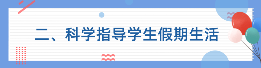 要根據(jù)當?shù)貙嶋H,立足于豐富假期生活、促進健康成長、增強實踐能力、培養(yǎng)創(chuàng)新精神,爭取有關部門和單位支持,廣泛利用體育館、博物館、文化館等社會資源,開展豐富多彩的活動,為孩子假期生活提供更多選擇。學校要掌握假期期間學生家庭監(jiān)護情況,按照中小學家訪“八條要求”,假期中每個學生至少安排一次家訪,了解學生的假期學習生活狀況,給予科學指導。要統(tǒng)籌調控不同年級、不同學科作業(yè)量和作業(yè)時間,科學布置暑假作業(yè),鼓勵布置活動性、實踐性、探究性作業(yè),可以安排適量的勞動家庭作業(yè),注重學生良好生活學習習慣的養(yǎng)成。要指導家長在做好疫情防控前提下,教育引導孩子加強體育鍛煉、開展文藝活動、強化勞動實踐、做好近視防控等,避免家長盲目送孩子參加輔導培訓,減輕學生培訓負擔。學校要統(tǒng)籌做好中高考畢業(yè)生的假期安排。要扎實做好內地民族班、特殊教育學校等假期留校學生管理服務工作,精心安排學習活動,做好生活保障,關注學生思想狀態(tài),嚴格落實值班帶班制度。