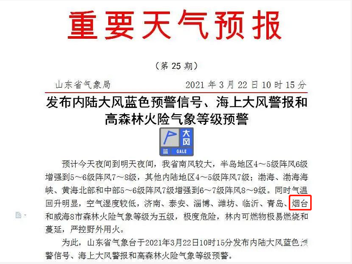 全宇宙只有不到1%的人點(diǎn)擊上方進(jìn)入招遠(yuǎn)信息港你真是個(gè)特別的人山東省氣象臺(tái)今天10時(shí)15分發(fā)布內(nèi)陸大風(fēng)藍(lán)色預(yù)警信號(hào)、海上大風(fēng)警報(bào)和高森林火險(xiǎn)氣象等級(jí)預(yù)警內(nèi)陸有8級(jí)南風(fēng),海上則達(dá)9級(jí)8個(gè)市森林火險(xiǎn)極度危險(xiǎn)