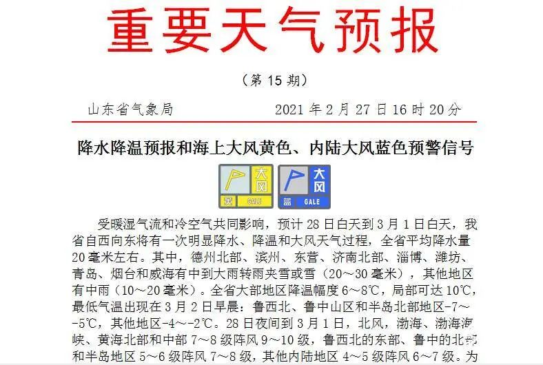 山東省氣象臺于2021年2月28日06時00分繼續(xù)發(fā)布內陸大風藍色預警信號↓↓今天夜間到明天,受冷空氣影響,我省將出現(xiàn)大風降溫天氣。北風,魯西北的東部、魯中的北部和半島地區(qū)5~6級陣風7~8級,其他地