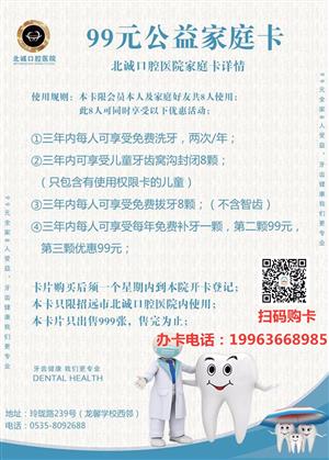 北誠口腔醫(yī)院 限量推出一款99元 公益家庭卡 99元8張卡,8人用(不是共享哦,而是每人都可以享受一遍以下的活動哦)